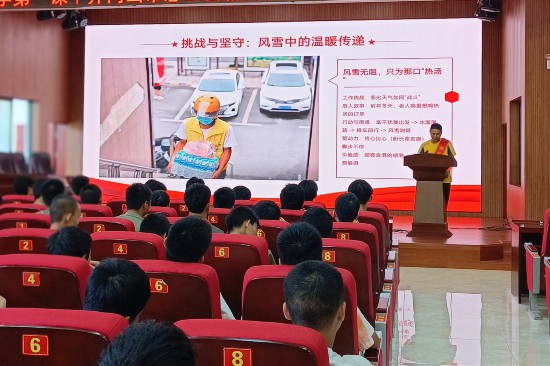 龍建平以《平凡崗位亦有光 外賣路上綻芳華》為主題,分享了自己作為外賣配送員的別樣奮斗路?!巴赓u箱里裝的不只是餐品,更是責(zé)任?!饼埥ㄆ降脑捄?jiǎn)單卻有力,讓學(xué)生們深刻領(lǐng)悟到“平凡崗位從不平凡,勞動(dòng)價(jià)值不分高低”。