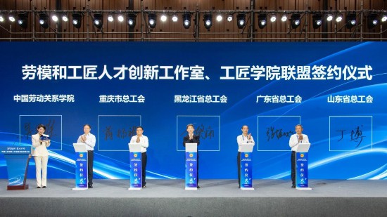 論壇現(xiàn)場(chǎng),中國(guó)勞動(dòng)關(guān)系學(xué)院與山東、廣東、黑龍江、重慶四?。ㄖ陛犑校┛偣?huì)共同簽署創(chuàng)新工作室與工匠學(xué)院聯(lián)盟協(xié)議。劉伯鳴等多位大國(guó)工匠共同點(diǎn)亮“創(chuàng)新版圖”并向廣大勞模工匠及產(chǎn)業(yè)工人發(fā)出聯(lián)合行動(dòng)倡議。論壇還發(fā)布了歷屆論壇征文學(xué)術(shù)成果——《勞模工匠創(chuàng)新工作室建設(shè)與發(fā)展案例匯編》。